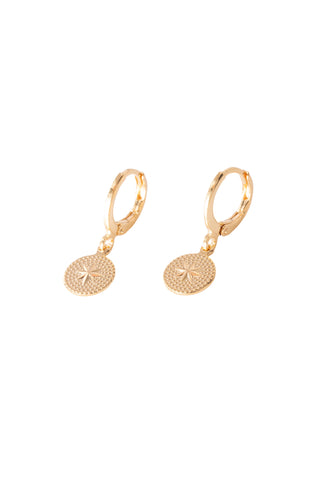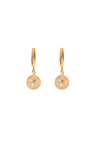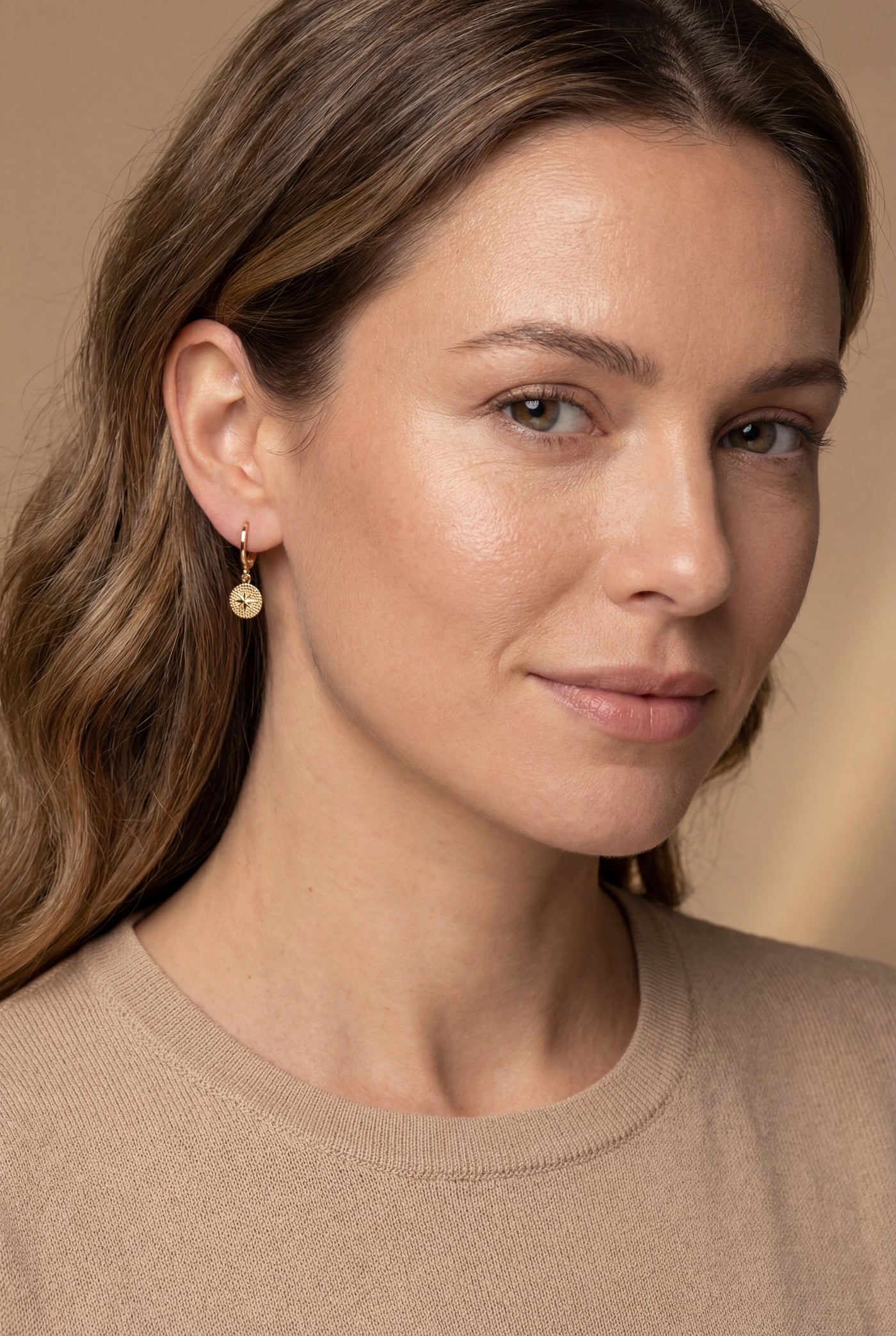 The Estrela Huggies feature smooth gold huggie earrings finished with a flat starburst coin disc. Refined and minimal, the pressed star adds subtle texture and meaning to a timeless silhouette designed to sit neatly against the ear.