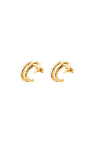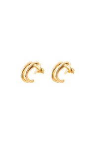 The Orgânica Earrings flow in sculptural waves that wrap gracefully beneath the ear. Two rounded gold arcs curve downward and meet at the base, creating the illusion of a double piercing with just one stud. With their thick, bubble-like form and polished golden shine, they bring both movement and presence — a design that feels fluid, bold, and timeless.