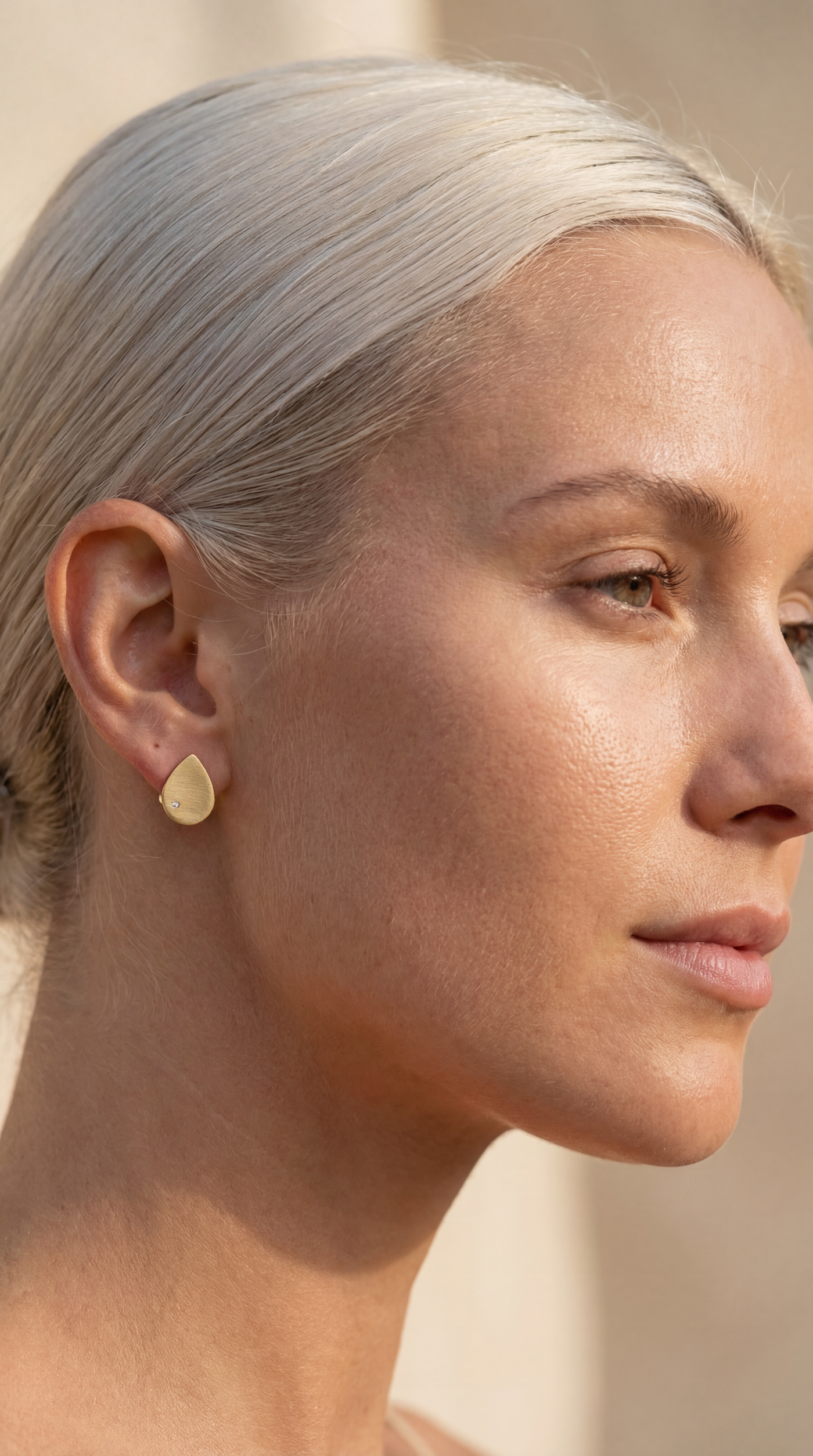 The Água Luz Studs feature a flat matte-finish teardrop stud with a single cubic zirconia stone set flush into the surface. Refined and minimal, the soft matte gold contrasts beautifully with the light-catching stone, creating a delicate piece with modern edge.